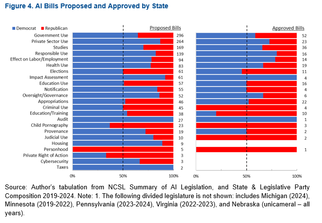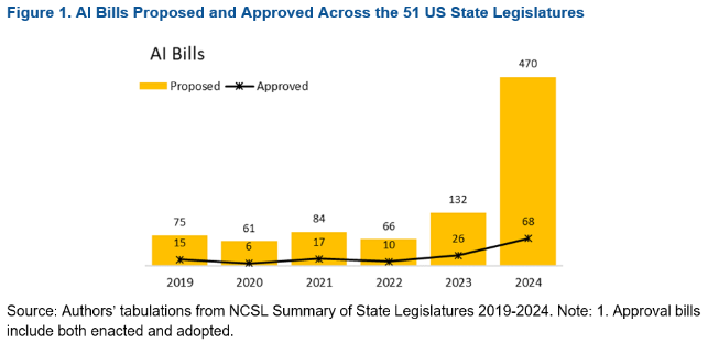 States take the lead: Nearly 900 AI bills proposed (2019–2024), with 142 passed, addressing government and private use, studies, responsible use, and labor impacts.