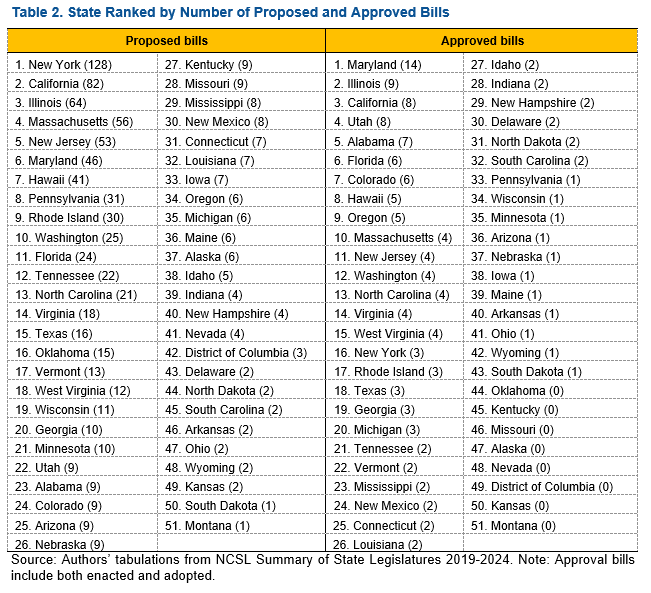 Figure 3 plots states, dividing them into four groups based on whether they are below or above the average in proposed (17.4) and approved (2.8) bills. Maryland, Illinois, and California stand out in the first group: above-average proponents and approvers. Other states in this group include Florida, Hawaii, New Jersey, New York, North Carolina, Massachusetts, Road Island, Virginia, and Washington. New York is an extreme case, where over 128 bills were proposed but only 3 were approved. The second group – above-average proponents but below-average approvers – includes Tennessee and Pennsylvania.