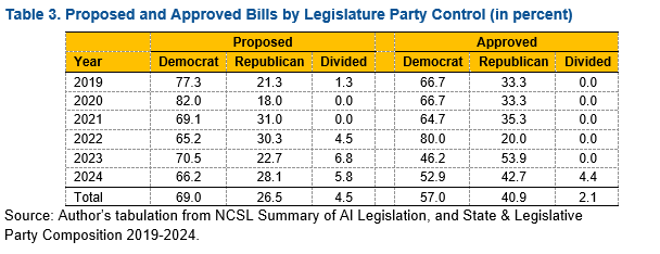 Between 2019 and 2024, Republicans controlled about 60 percent of state legislatures and Democrats 40 percent. About 70 percent of all proposed, and 57 percent of the approved, AI bills originated in Democrat-controlled legislatures. However, AI regulation is increasingly appearing in Republican-controlled legislatures as well (Table 3). Furthermore, while Republican legislatures proposed 26 percent of all bills, they approved 41 percent of them. Overall, Democrat-controlled assemblies have been more active in proposing bills, but Republican ones have approved a higher share of what has been proposed.