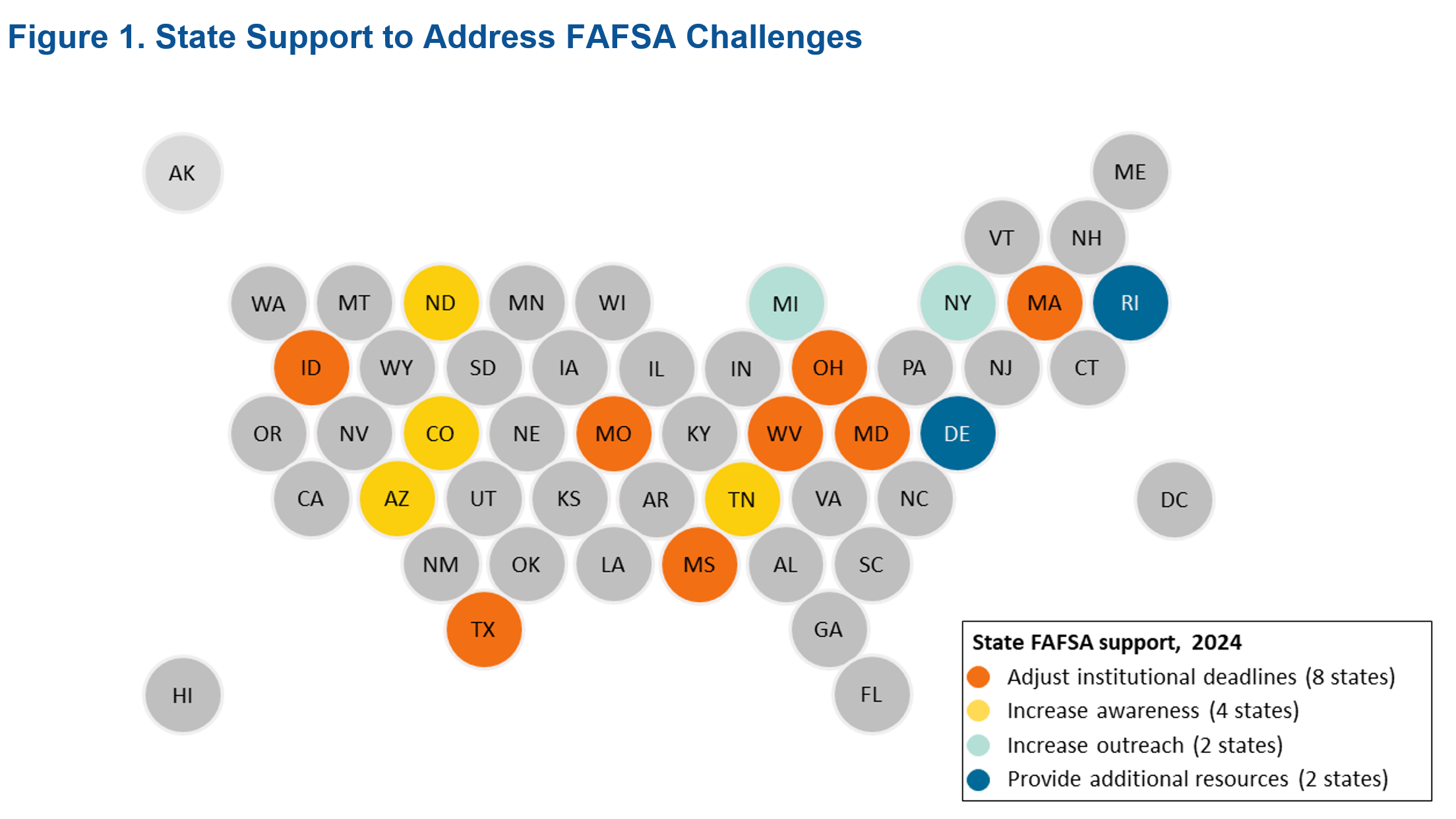 As colleges and universities determine how to provide access and opportunities to students who may be affected until the federal government resolves the form issues, states are stepping in to provide additional resources (DE, RI), increase outreach (MI, NW), raise awareness (AZ, TN, CO, ND), and adjust institutional deadlines (ID, MD, MS, MO, OH, TX, WV) to mitigate the impacts of the delay (Figure 1). As a result, more than 135 colleges and universities nationwide have extended their commitment deadlines.Federal government measures to remedy the situation include the Better FAFSA Better Future Roadmap tool by the Federal Student Aid (FSA), designed as a resource and training guide for families, schools and institutions, and other stakeholders. A soft launch approach was instituted to address emerging concerns as they arose rather than all at once. Additionally, federal financial aid experts and internal concierge services were dispatched to HBCUs, tribal colleges, and other historically low-resourced institutions for support and training as part of the rollout.