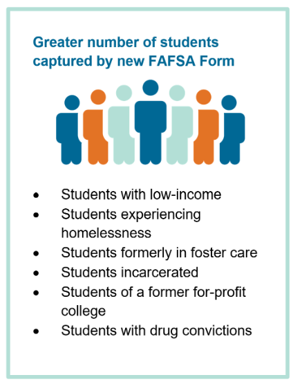The FAFSA revisions are expected to broaden eligibility criteria, capturing students previously excluded from financial aid programs (students experiencing homelessness, formerly in foster care, formerly incarcerated, formerly enrolled in a for-profit college, and students with drug convictions). This fundamentally equitable and wider net will significantly improve access to financial aid for a wide range of students once caught in the crosshairs of societal ills.